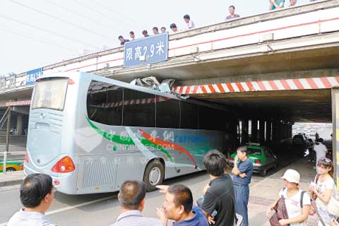 2009年7月29日上午8点50分,一辆大型客车通过西安市南二环长安路立交桥时,车顶的空调撞上桥底,半个车身被卡在限高2.9米的通道内。最终经过众人4个小时的努力,大客车才从通道内艰难驶出。
