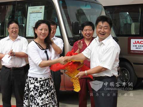 活动最后,许树生副总经理向宝斯通项目组副组长蔡瑞玲女士颁发了出征金钥匙。在一声声礼炮的祝福下,在热烈的掌声中,江淮宝斯通2009年全国性试乘试驾拉开了帷幕。