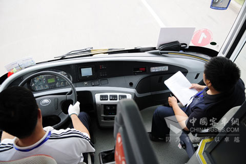 说起丁志强,不得不说他的好习惯。第一,平时很在意怎么能省油。“我的脚很轻,节油,全是脚上的功夫。”丁志强说。第二,平时没事就喜欢读书看报,特别是交通方面的知识,所以这次大赛的理论考试,他拿了99分。第三,他喜欢发问,喜欢探索。大家还在闲聊时,他就一边向宇通技术工程师付明利讨教,一边自己坐在比赛用车上,试试档位。“我的车是5档,但这次比赛用车是6档,否则我的成绩会更好。”看来,丁师傅追求的是“更快 更高 更强”这一境界。提起9月份在河南举办的全国总决赛,这位每天开着ZK6930H跑“前旗—临河”线路的驾驶员,显得很有信心。——在平时的运营中,一个往返他就能比他的替班驾驶员省大约6升油。