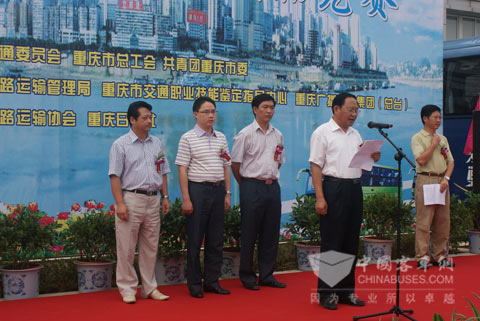 28日上午,重庆市交通运输委员会、重庆市总工会、共青团重庆市委等部门的领导出席了活动的启动仪式并讲话。通过本次比赛,重庆市各交通运输行业将积极响应国家交通运输部推进节能减排工作的号召、借此“宇通杯”节能技能竞赛的契机,应该深入在各县、市开展节能减排的推广工作。