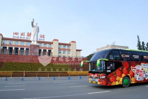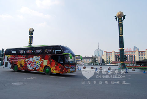 在一天的巡游途中,身涂“声震八方”和“黄海客车”醒目标识的黄海音乐大巴,分别在成都武侯祠、天府广场、宽窄巷子、府南河等成都标志性建筑前停留,吸引了不少成都市民的目光。巡游途中,高大威猛的黄海DD6129K02为这个古老的城市增添了一抹亮丽的色彩。