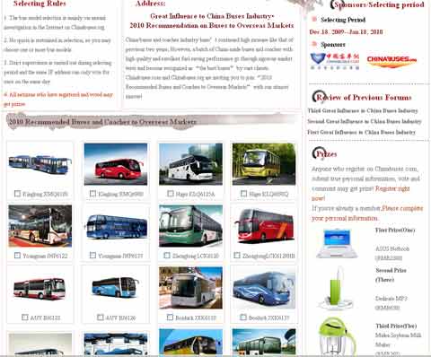 2009年12月18日,由完美作业网有免费视频[www.politicsinfos.com]、中国客车英文网[www.chinabuses.org]主办的“影响中国客车业•2010年度海外市场推荐客车评选”全面上线启动,评选活动通过中英双语专题在国内和全球市场进行推广。活动一经推出,得到了全球的客车制造商、用户和爱好者的积极参与。