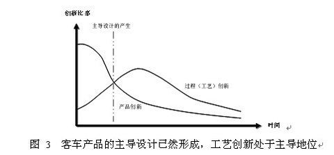 第三,技术工艺方面,在保障技术优势的前提下,需要更为侧重于制造工艺的改进。大规模定制建立在企业对原有生产体系、技术系统的过程重组基础上,因此,它是以企业技术创新为前提的。除此以外,工艺创新作为创新的另一种体现形式,将在大规模定制范式下,扮演更为重要的角色。N. Abernathy和J.M. Utterback在其援引率颇高的AU模型中,明确了技术创新与工艺创新的关系(图3)。客车制造属于成熟化产业,其产品主导设计已然形成,工艺创新占据主体地位。而大规模定制范式,又进一步将制造工艺的确定,优先于产品开发。它通过模块化生产、并行工程等手段,提高了工艺过程对与产品特征变化的适应力,使得满足客户个性化需求的产品,在灵活、敏捷、稳定的工艺过程中,完成最终交付。如今年6月再次刷新了节油纪录的苏州金龙KLQ6116TE3型客车,就是在2003年成熟车型的基础上,通过工艺改进,调整了零部件匹配性,优化了各项参数,从而赢得定制客户的高度认可。