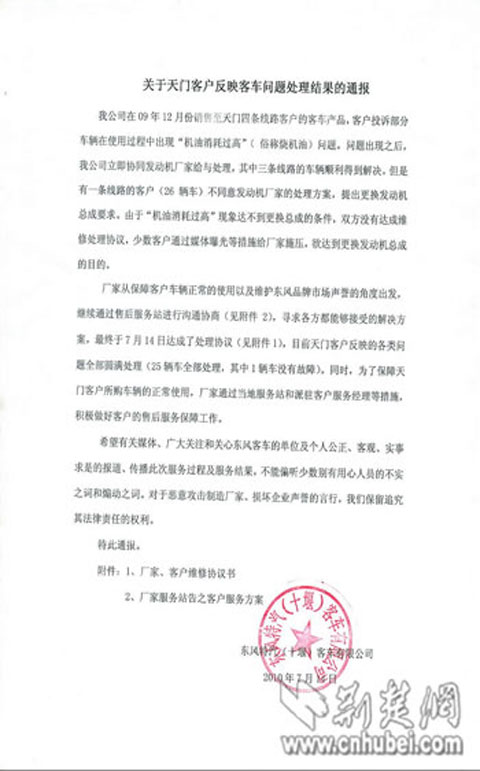 2010年7月14日,25辆客车车主与东风特汽(十堰)客车有限公司达成维修协议:对耗机油部分车辆发动机给予更换活塞环、活塞、气缸套、气门油封处理;发动机从修复日期重新给予三包;给车主12桶机油作为补贴……