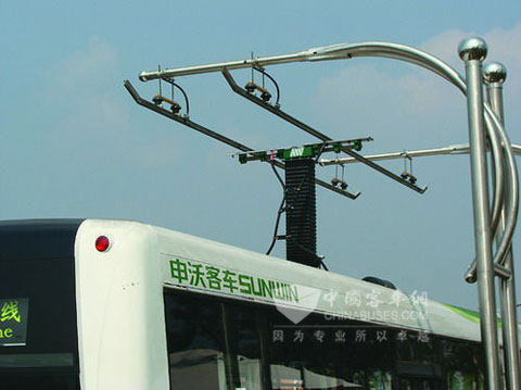 上海世博园区运行的每辆超级电容公交车上,都安装着一个特殊的监视器,用来监测充电情况。据记者观察,超级电容公交车每到一站,就会从车顶伸出一个接头,接到充电架上充电。