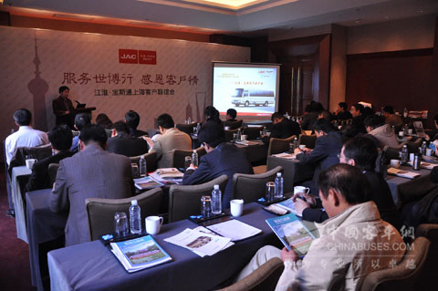 2010年11月12日,江淮客车“服务世博行,感恩客户情”上海客户联谊会在上海宏泉丽笙大酒店拉开帷幕,上海市交通局领导及旅游、租赁公司总经理共40余人参加,共同分享宝斯通成功服务世博会的真实历程。