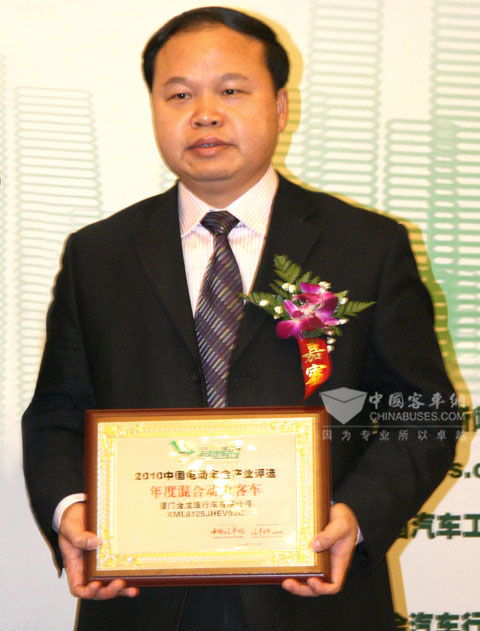 厦门金旅总经理助理、技术中心主任赖志艺接受年度混合动力客车证书
