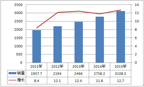 2011年-2015年中国汽车销量预测 单位:万辆,%