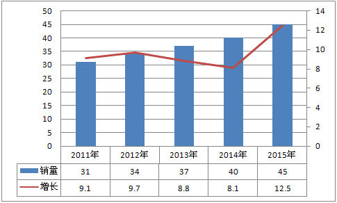 根据宏观经济及政策法规判断,2011年汽车市场宏观环境肯定没有2010年好,另外,2010年汽车市场尤其是乘用车市场的高速增长在一定程度上透支了2011年的汽车市场需求。但是,中国汽车市场刚性需求仍然很大,据公安部统计,至2009年底,我国汽车保有量6209.41万辆。其中载客汽车保有量为4840.81万辆,载货汽车保有量为1368.61万辆。以13.35亿人口计算,2009年中国千人汽车拥有量为46.5辆。2009年中国千人载客汽车拥有量为34.4辆。与国际发达国家相比,千人汽车保有量仍很低,所以汽车市场远未达到饱和状态。预计2011年汽车市场销量将达到约1957万辆,同比增长约8.4%。2012年汽车市场销量增幅会有所提高。2013年和2014年增长幅度将继续保持平稳,2015年会保持惯性增长。