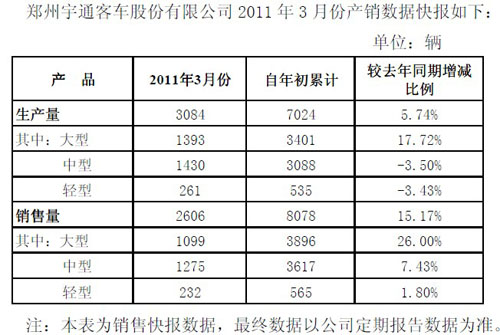 宇通2011年3月总共销售2606辆,同比增长15%,主要销售数据如下表: