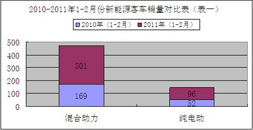 根据2011年全国各地登记注册车辆显示,2011年1-2月份全国新能源客车累计销售397辆,其中混合动力客车销售301辆,电动客车(含无轨电动车)销售96辆,同比分别销量增长177辆,132辆和44辆,增长率为80%、78%和84%。相关数据见表一:
