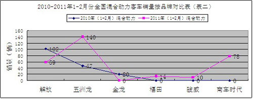 在2011年前两个月,五洲龙蝉联全国混合动力客车销售冠军,累计销售140辆,占全国市场份额的46.5%,是销量第二名的1.8倍,占有绝对的市场份额优势。从销量增长上来看,同比增长数量93辆,优势也十分明显,与一汽解放的急剧下滑形成鲜明对比(详情见表二)。