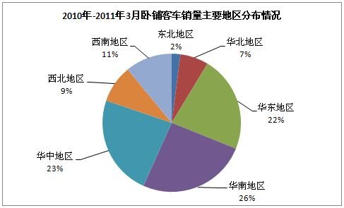 从区域分布上来看,卧铺客车销量主要分布在华南、华东和华中等经济发达地区,这些地区客流量相对较大,客源稳定,三个地区的销量占卧铺客车总体市场超过7成的市场份额。