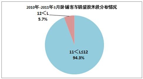 2011年一季度,我国共销售卧铺客车1430辆,累计增长24.02%,其中1-3月各月分别销售1090辆、70辆和270辆,1月卧铺客车销量创历月之最,但由于基数过小,对于大中型客车总体市场的影响很小。