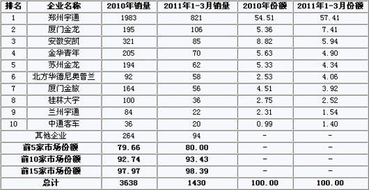 2010年-2011年3月卧铺客车企业销量及份额变化情况表 单位:辆、%
