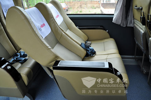 从乘坐空间来看,本次试乘的KLQ6142BAE4L拥有39+1+1的座位。乘客区每排三个座位,分别是左侧两个,右侧一个。全真皮的高背座椅,乘客休息的时候,头部完全可以放置在座椅上,下面还有放腿脚的踏板支撑。KLQ6142BAE4L的座位宽度可以和飞机头等舱媲美,前排座椅后背上有专门放置茶杯的装置,便于长途旅行。记者注意到,当前排乘客把座椅调整到140度角的时候,身高162厘米的记者依然可以出入,但是如果是体重更大的男士,则需要前排乘客调整下座椅。