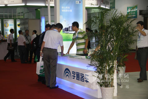如果说室外的客车展台仅仅展示了车辆的外观,那么二楼的宇通展台则揭开了宇通新能源客车的心脏。这块正对着出入口的81平米展台,不仅详细展示了郑州新能源基地的建设情况、技术研发实力,还介绍了新能源客车投入运行的实际状况。
