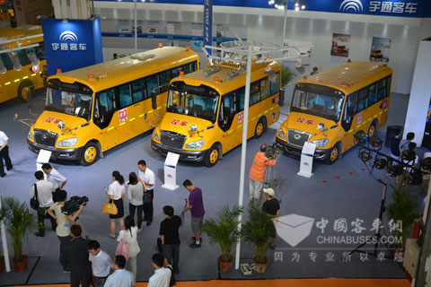 此次展会,宇通校车此次携带ZK6559DX5、ZK6809DX6、ZK6609DX7、ZK6119DX四款第二代新国标车型参展。这些车型凭借领先业界的宇通校车360°安全系统解决方案,为学童提供完善的主、被动安全保障。宇通第二代校车在安全产品、安全管理、安全教育和无忧服务四个方面进行全新升级,有效保障校车安全。安全产品方面,宇通校车在骨架强度与密度、车体结构、360度环视系统等多个方面超越新国标,其中骨架采用强度高、密度轻的高强度钢,并以0.8米的骨架间隙显著高于1.0米的新国标;安全管理方面,宇通校车搭载独有的安芯智能管理系统,可有效实现对校车运行状态的全面监控,而且在导航定位功能方面可提供GPS和北斗两种版本的安芯产品供用户选择;安全教育和无忧服务方面,宇通校车联合中国人保从2013年3月25日起开始为每辆校车的学生座位赠送每座高达30万元的承运人责任险,安全更贴心。同期启动的“宇通360°校车安全行”的市场专项服务活动,为广大宇通校车用户提供免费检查,向客户免费发放近2万册(页)的安全手册和宣传页,并对广大校车驾驶员进行现场安全驾驶指导和校车日常维保的专业培训,还通过逃生演练视频、安全教育手册等多种手段进行教育培训,提升相关人员的安全意识。