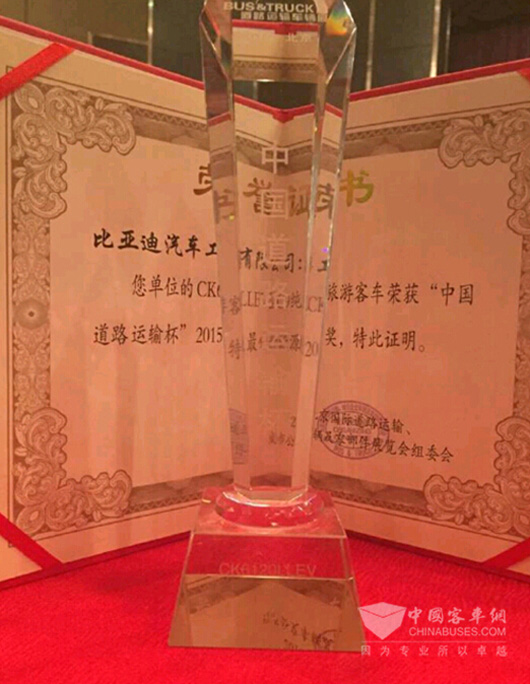 据悉,2015年5月11日晚,比亚迪纯电动旅游客车C9在北京被授予“中国道路运输杯”2015年度最佳新能源客车奖。C9作为比亚迪在旅游客车领域的诚意之作,曾在广东省科技创新大会作为贵宾接送车首次投入运营,运营期间凭借其出色的性能以及舒适的乘坐体验获得参会领导的一致好评。