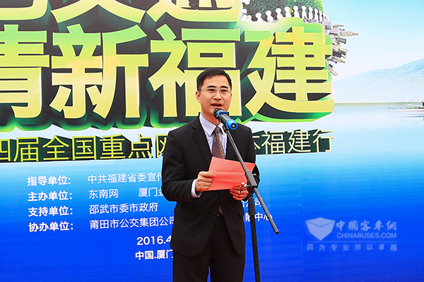 启动仪式上,活动主办方代表、厦门金龙旅行车有限公司常务副总经理彭东庆表示:“此次采访活动,不单是宣传福建这个全国唯一一个水、空气、生态环境全优的省份,更是传递节能环保、绿色出行的理念。金旅很高兴能参与这个活动。”