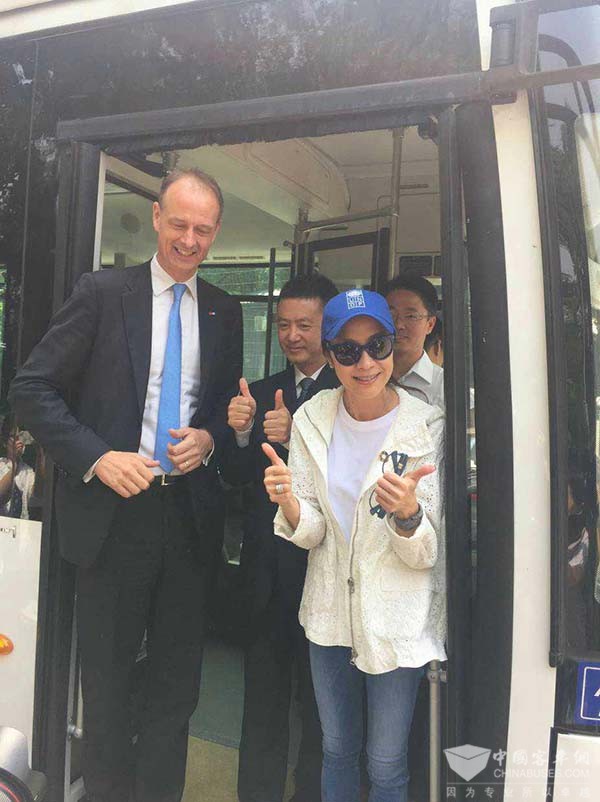 试乘福田欧辉氢燃料电池客车后杨紫琼竖起大拇指