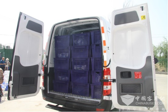 “南京金龙D11系列车型是其中典型的一款精品”,张院长补充介绍:“D11有效载货空间高达12.3立方米,车内可根据客户业务需求设置多个功能区、多维度延展空间,实现了运载量的最大化。此外,折叠式货架、可折叠搁板、拉伸式货架、货物分层架等设备自由选配,双高开尾门设计,可使得装载货物更加灵活便捷。”