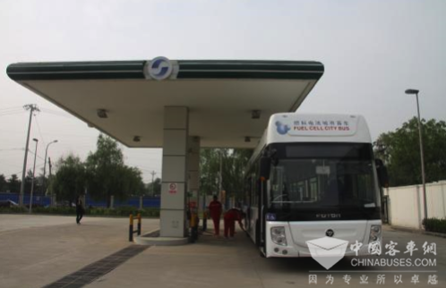 正在加氢的福田欧辉氢燃料电池客车