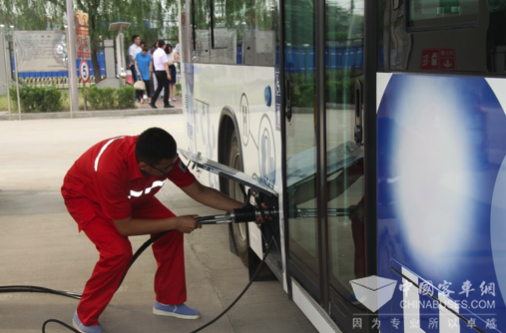 工作人员正在为福田氢燃料电池客车加氢