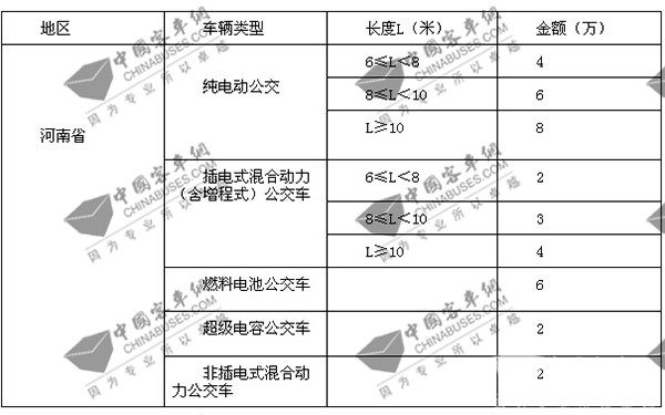 补贴的车辆类型包括纯电动公交车、插电式混合动力(含增程式)公交车、燃料电池公交车、超级电容公交车、非插电式混合动力公交等。其中,纯电动公交车和插 电式混合动力(含增程式)公交车根据车体长度划分三个不同的补贴级别。纯电动公交车每辆每年补贴4-8万元,插电式混合动力公交每辆每年补贴2-4万元。 燃料电池公交车每辆每年补助6万元,超级电容公交和非插电式混合动力公交车每辆每年补贴2万元。如下表所示。