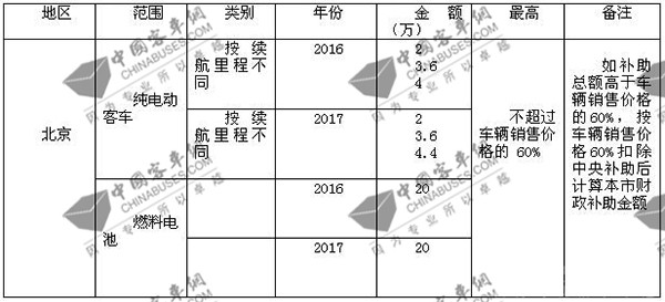 北京市规定纯电动小客车2016年按续驶里程不同分别补贴2.5万、4.5万和5.5万;2017年按续驶里程不同分别 补贴2万、3.6万和4.4万。燃料电池小客车2016和2017年各补贴20万元。汽车生产企业申请中央和本市财政补助总额最高不超过车辆销售价格的 60%。如补助总额高于车辆销售价格的60%,按车辆销售价格60%扣除中央补助后计算本市财政补助金额。在中央补助基础上,北京市纯电动客车补助按中央标准1:1确定,2017年补助标准在2016年基础上下降20%。