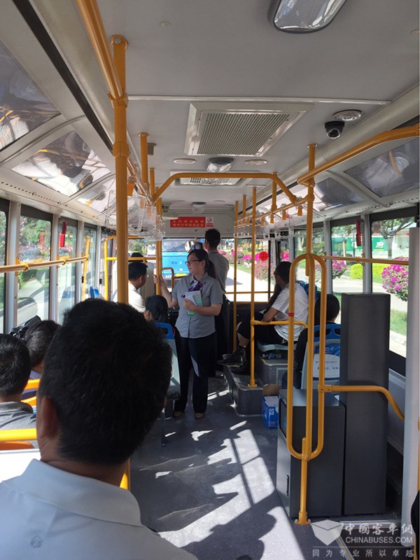 在现场体验活动中,可以观察到,车厢内站立空间大,全铝合金风道时尚美观,车内安装有CAN总线仪表,智能终端显示屏等先进设备。在现场演示中,据恒通技术人员介绍:“当车辆车门未关闭时,系统不仅会自动提示驾驶员,而且车辆无法启动;当车辆速度大于5KM/h时,车辆乘客门无法打开,这在很大程度上保障了运营安全”。