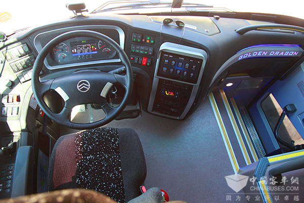 在高度重视乘坐舒适性之外,新锦程对于驾驶区及驾驶者的关注同样超过以往,这一点体现了国内客车设计制造理念的变化与进步。在过往试驾客车时我都会发现一个问题,设计者对于驾驶区的设计相对简单,不愿为此增加整车成本。新锦程首先创新性地采用了一款具有记忆功能的空气悬浮驾驶员座椅,大大提高了驾驶员长时间驾驶的舒适性。在功能区分区及按键分布上面,充分考虑到驾驶员使用习惯,尽可能做到易于识别和便于操控。驾驶区左侧主要为挡位、动力模式切换及安全装置控制区,右侧为灯光、车门控制区,中控台则集成了多功能显示屏、影音系统、自动空调、导游广播系统及行车记录仪等,整体布置紧凑而层次分明。