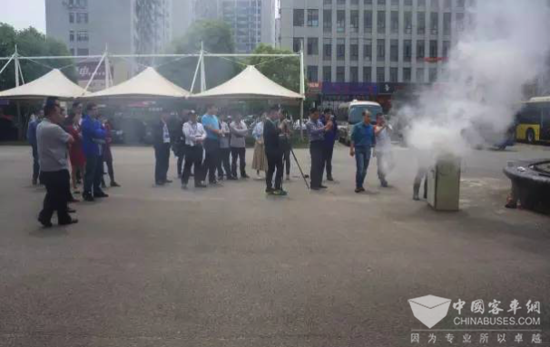当天,灭火装置在厂区进行了现场演示,试验结果发现扬子江纯电动汽车配套的封闭和半封闭空间高效自动灭火装置不仅具有火患探测,声光报警、自动启动、手动启动以及灭火装置启动反馈等多项功能,还可以通过在车辆电池舱等隐患部位安装灭火系统,迅速发现火情,并从源头扑灭,用时仅需3秒,具有保护司乘人员人身安全的显著效果。