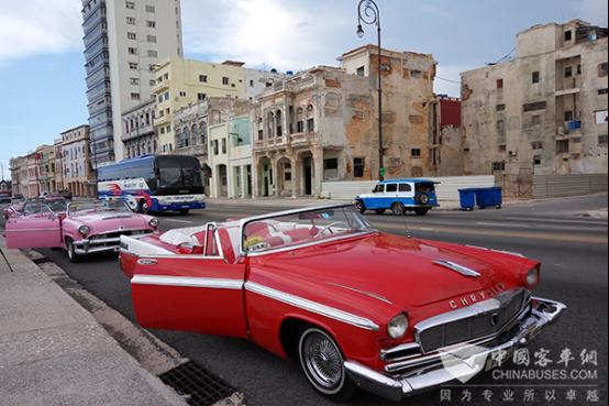 古巴街头的老爷车和宇通客车显示着这个国家的古老与现代