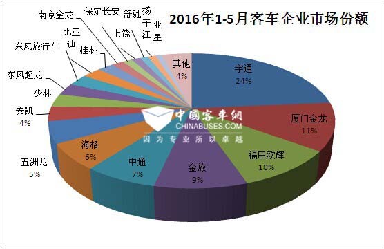 对比2016年1-5月客车企业市场份额,格局并未发生太大变化。宇通、厦门金龙、欧辉依旧占据市场前三。