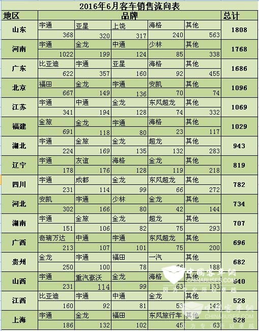 2016年6月,山东、河南、广东、北京等地区销量领先。下图为,2016年6月,分地区销量最多的客车品牌。(单位:辆)