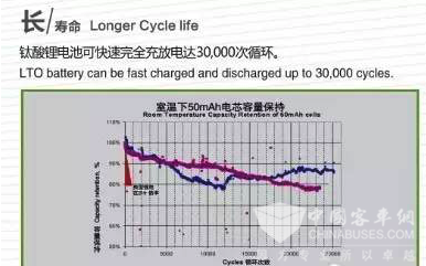 试验显示,常用的锂电池循环2000~3000次已无法使用,而钛酸锂电池可循环30000次以上,且容量仍保持在80%左右。