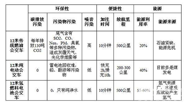 氢燃料电池汽车与传统汽车、纯电动汽车对比(以12米公交车为例)