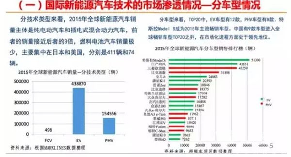 从车型来看,目前,主要还是在纯电动和插电式混合动力这一块,特别是纯电动汽车的量最大。燃料电池汽车现在从全球看处于产业化的初期,主要的销量是在日本、美国,实际上主要是丰田的销量。2015年大概是500辆的市场规模。