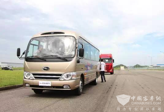 在试乘试驾过程中,受到媒体一致肯定的还有E-COUNTY表现出来的稳定性和车身对振动和冲撞的缓冲。作为一台会在公路、高速、山路、坡路等各种路况行驶,会乘载老人、小孩的中巴车,拥有良好的底盘和严密的安全防护措施非常重要。E-COUNTY采用韩国进口前独立悬架,韩国原装车架,这让车辆在行驶过程中非常稳定。 ABS防抱死系统、预装倒车影像线束、后挡玻璃热线除霜系统、红外防夹装置的多项安全装备,将隐患消除于无形。