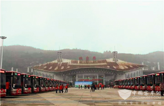 2015年12月22日,中车时代电动新能源客车在张家界火车站广场整齐列队