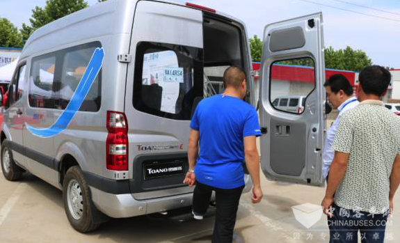 品鉴之旅首日上午,现场迎来了图雅诺国V的第一位购车者——创业者李先生。销售人员向李先生介绍福田图雅诺国V所带来的“价值升级”,并邀请李先生上车体验,李先生对图雅诺国V赞誉有加。在与销售人员的沟通中李先生表示,他在市里开了一家婚庆公司,经常有布置庆典场地和婚纱摄影的活儿,图雅诺国V的大空间能多装物料,在去很远的地方外拍的时候,舒适的乘坐空间也能够提升客户对服务的满意度,进而为他带来更多的客源,而且高大上的外形开出去也很有面子。