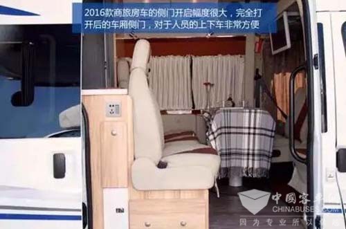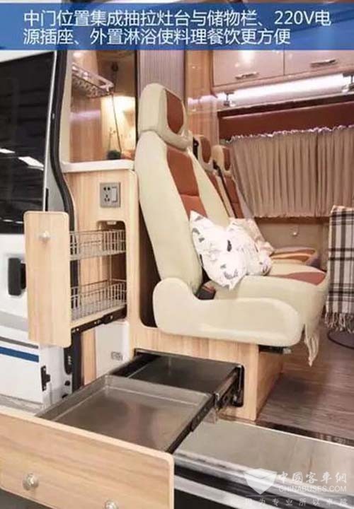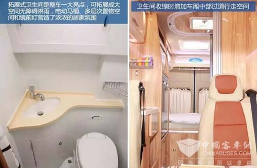 卫生间的收缩功能十分实用,需要使用时拉开,能给淋浴间的使用增加相当大的空间。平时收起,车内过道就显得十分宽敞了。不仅如此,卫生间使用的是防水材料,地板上有导流槽,不用担心沐浴时水渗漏到车内。