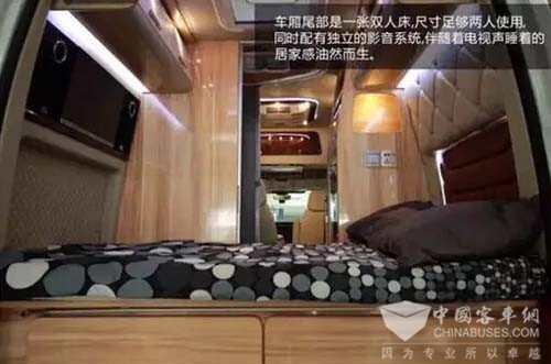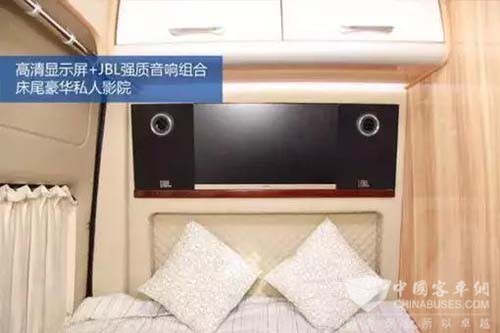 移动星级宾馆卧室自然是重中之重 ! 豪华双人床搭配时尚感极强的软包,看着就能感受到那种舒适!床尾上部的高清显示屏+JBL强质音响组合第二影音系统给人的感官强烈。同时水滴式吊柜、多面立体灯光等行车封闭式隐私空间尽显温馨与舒适。