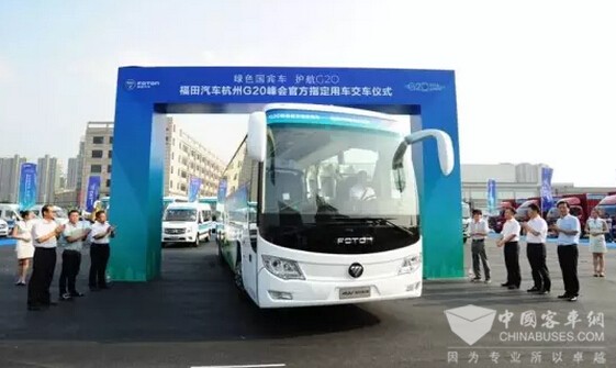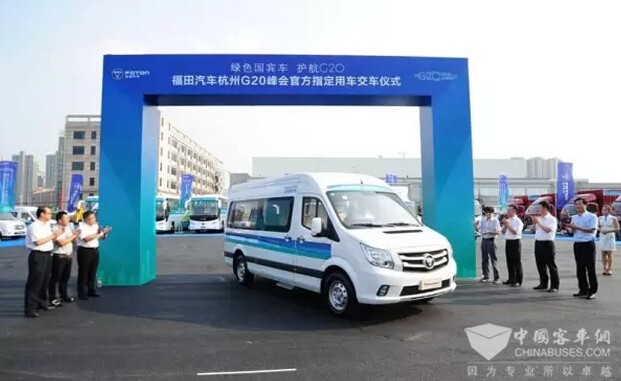 2016年8月16日,杭州萧山,国内最大的商用车集团福田汽车正式将旗下欧辉、欧马可、图雅诺及欧曼四款车型,共计180辆绿色国宾车交付G20峰会组委会。据悉,这些“绿色国宾车”是本次G20峰会的唯一全系列绿色能源车型,将为本次G20峰会嘉宾提供绿色、尊贵、安全、舒适的出行服务。