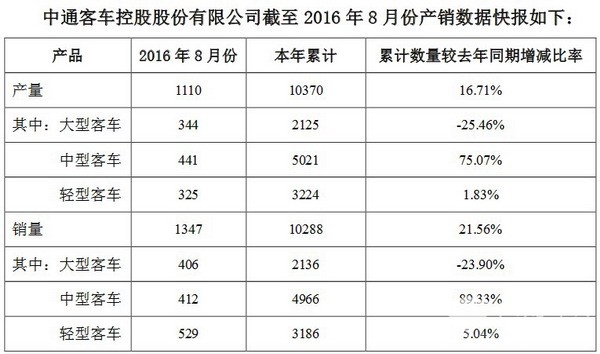 中通客车发布8月份产销快报,数据显示,1-8月份中通客车累计产量10370辆,同比上涨16.71%,其中大型客车产量降25.46%,中型客车、轻型客车产量分别上涨75.07%和1.83%。