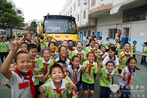 小朋友们在金旅校车前快乐合影卡通形象深得童心 竞答互动嗨爆全场