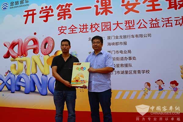 厦门金旅特别制作了《小金象儿童安全手册》,通过漫画的形式,让小朋友们在有趣的阅读后,学习从生活的各种细节中去注意安全。活动的最后一环节,便是赠书仪式,厦门金旅总经理助理、工会主席王立志将安全手册送到厦门市湖里区育青学校校长杨军的手中,台下掌声雷动,获得好评。此外,厦门市电业局也带来了用电安全手册,并赠给了学校。