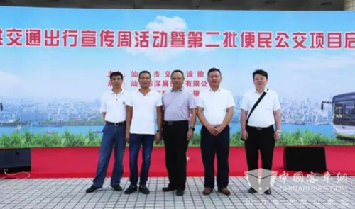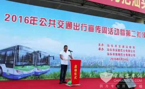 2016年9月24日上午,由广东省汕头市公交运输局主办,汕头市深展巴士有限公司、汕头市南翔巴士有限公司承办,珠海银隆新能源有限公司协办的2016年公共交通出行宣传周活动暨第二批便民公交项目启动仪式在汕头市举行。汕头市长刘小涛、副市长李耿坚、市政协副主席杜怀丹、市交通局局长陈少辉、公交管理处处长林荔松等领导参加了本次活动。
