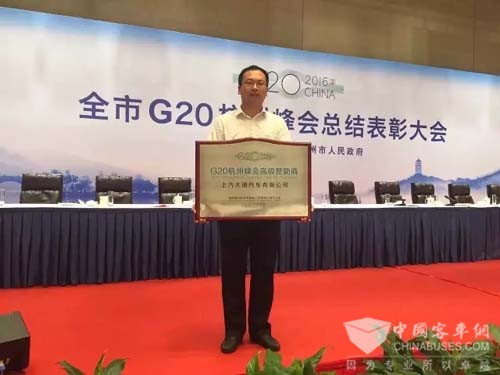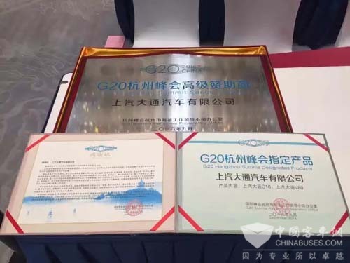 在表彰大会上,国际峰会杭州市筹备工作领导小组办公室为上汽大通汽车有限公司办法了【G20杭州峰会高级赞助商】的称号奖项,并充分肯定了上汽大通V80与G10依靠其优质的性能与过硬的质量为峰会做出的服务贡献。